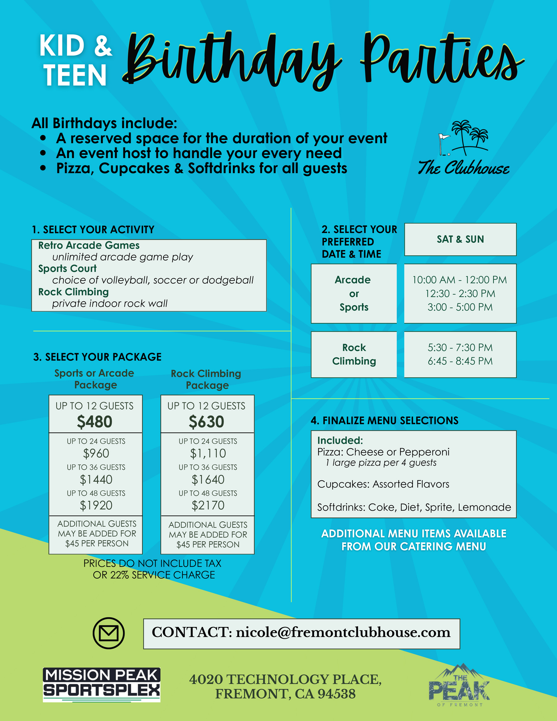 Celebrate life’s milestones at The Clubhouse of Fremont! From kids’ parties with rock climbing and games to elegant gatherings for any age, we offer versatile spaces and tailored experiences to make your special day unforgettable.